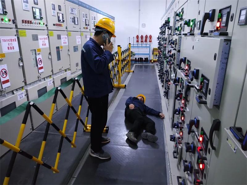 演练模拟电气作业人员在检修电气设备时未及时发现电源线路裸露情况,不慎触电晕倒的情景。监护人员发现险情后,立即呼喊并切断电源,使用绝缘器材帮助触电人员脱离电源,并第一时间上报总指挥,启动应急救援预案。