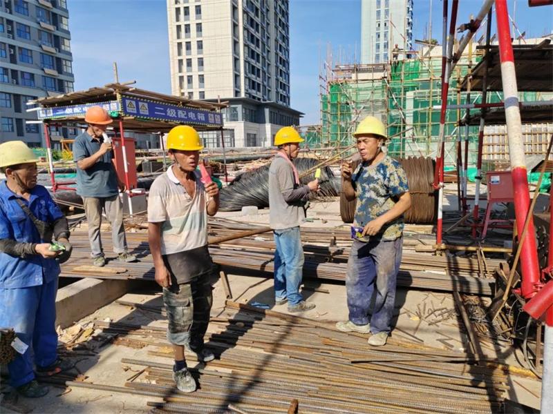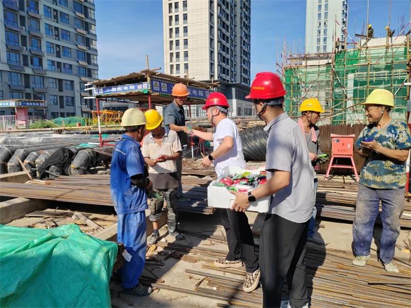 恒基置业总经理王统鑫带队深入施工区,将冰镇饮料、冰棍等解暑物资逐一送到工人手中,同时认真倾听一线作业人员关于高温施工的实际困难与需求。他反复叮嘱项目负责人要严格遵守集团公司错时施工要求,强调各项目部需科学调整作业时间,实行“抓早晚、歇中间”的错时施工制度,避开高温时段,当最高气温达到40°C以上时,应当停止当日室外露天作业;要加强高温作业安全巡查,重点检查临时用电、消防设施及防暑物资配备情况;要同步开展防暑应急知识培训,确保每位工人掌握中暑症状识别与初期急救方法。