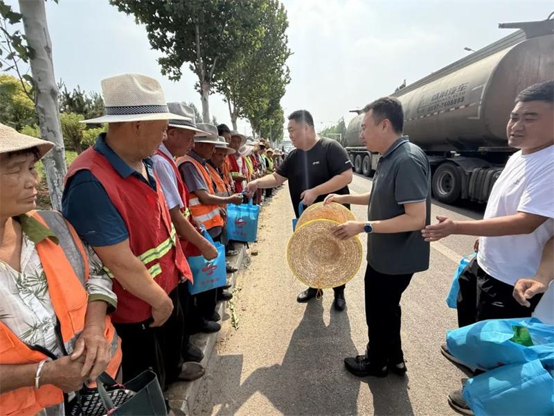 在堡头大街绿化施工现场,王统亚将遮阳帽、水杯、藿香正气水、茶叶等防暑用品逐一递到工人手中。他叮嘱大家要注意劳逸结合、尽量避开正午高温时段作业,并详细询问防暑措施的具体落实情况,特别提醒项目负责人要备足饮用水、设置阴凉休息区,切实把防护措施落细落实。