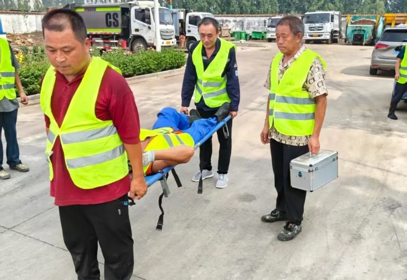 本次演练紧密结合垃圾清运作业实际场景,模拟一名工人在挂桶操作过程中因操作不慎导致手部被挤压受伤的情形。事故发生后,现场作业人员立即按下设备急停按钮,并第一时间大声呼喊提醒周边同事远离危险区域。各应急小组人员迅速响应,按照应急预案迅速启动应急处置程序,有序完成了险情上报、危险区域隔离、伤员初步急救、联系医疗救援等环节。