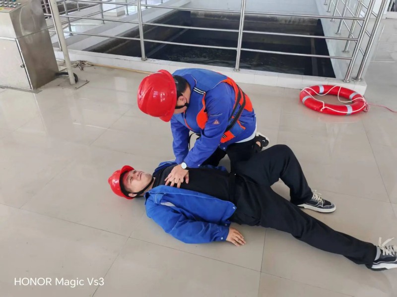 本次应急演练模拟作业人员不慎溺水的场景,值班人员迅速启动应急预案,精准抛出救生圈,救援小组快速到位,将“溺水者”救离水面并进行初步医疗救护。整个演练过程响应迅速、措施得当,有效检验了员工应对人身安全事故的实战能力。