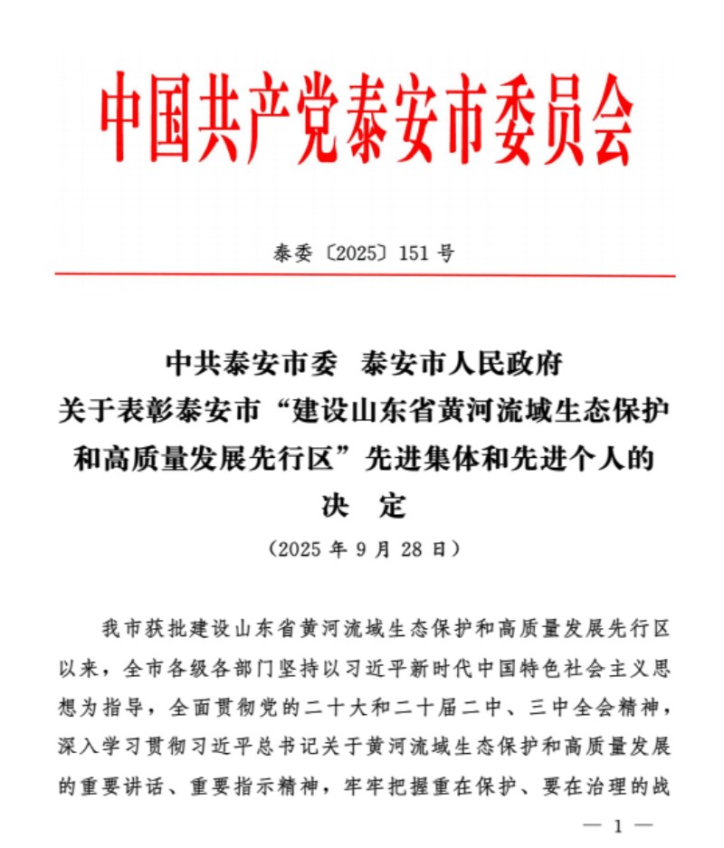 9月28日,中共泰安市委 泰安市人民政府下发《关于表彰泰安市“建设山东省黄河流域生态保护和高质量发展先行区”先进集体和先进个人的决定》,山东经开水务发展有限公司入选先进集体名单。