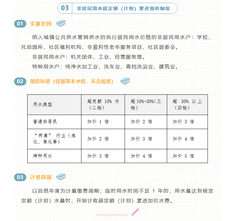 为规范供水价格管理,保障居民用水权益,根据宁阳县发改局《关于泰安市恒通水务有限公司供水基本水价执行标准的批复》宁发改价格【2020】87号、县水利局《关于调整水资源税征收标准的通知》宁水资字【2017】5号、宁阳县物价局《关于调整我县污水处理费征收标准的通知》宁价费发【2017】39号及《关于宁阳县居民用水实行阶梯价格的通知》宁价费发【2017】59号、市发改委、水利局《关于泰安市城镇非居民用水超定额(计划)累进加价制度的通知》泰发改价格【2023】372 号文件规定,现将公司水费标准、阶梯水价规则、累进加价制度、特殊群体优惠政策等事项公示如下: